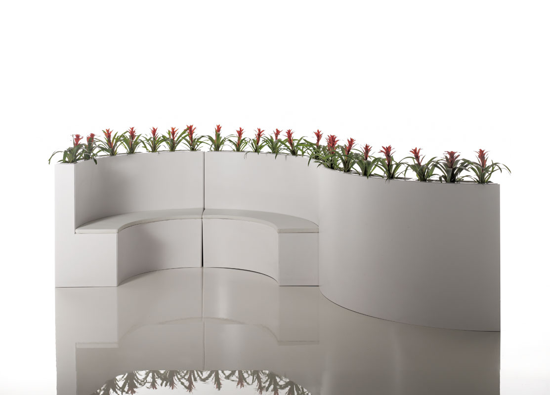 Sirkel tavolo fioriera rotondo in alluminio smaltato in bianco opaco, disponibile la versione in due semicerchi per posizionamento intorno ad alberi esistenti panca fioriera in alluminio smaltato in bianco opaco con cuscino in ecopelle