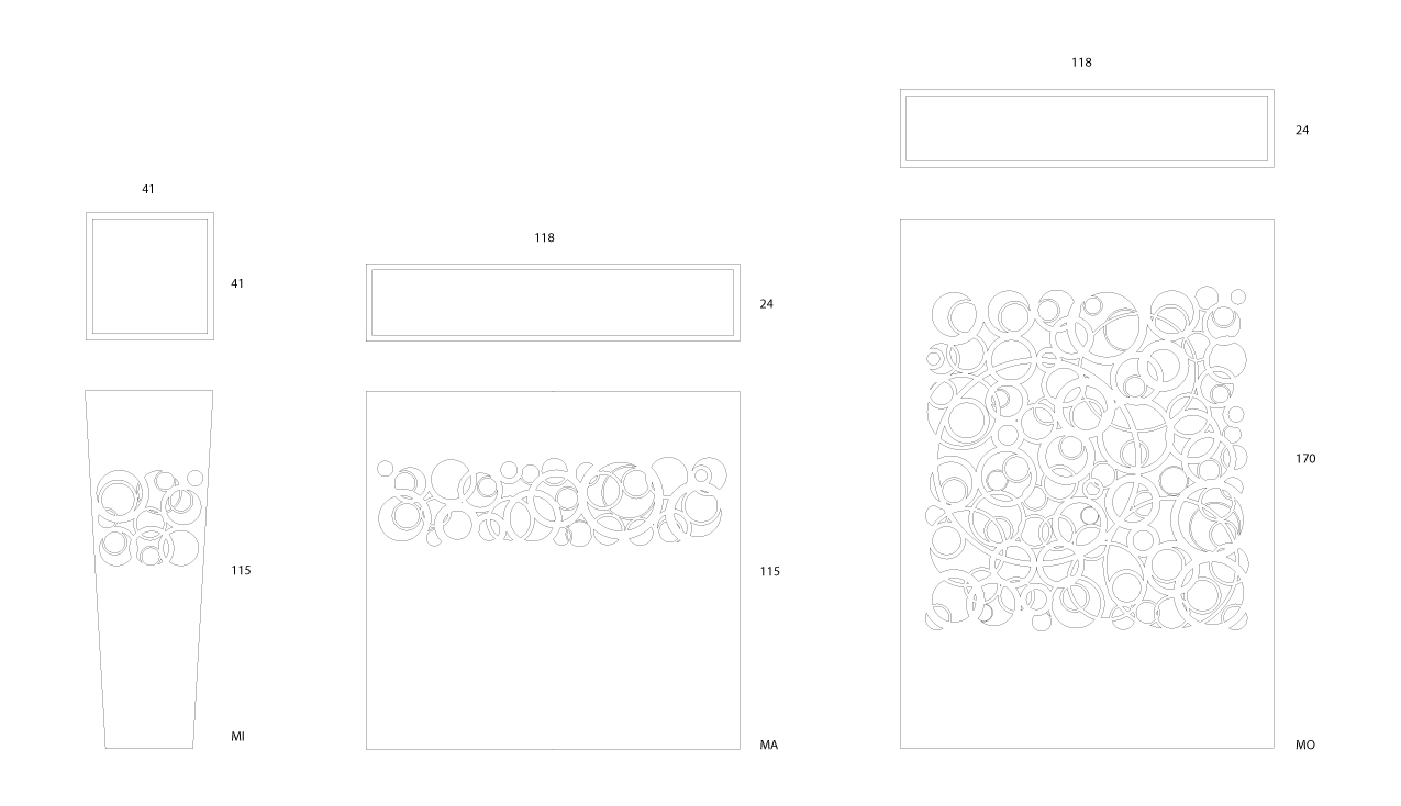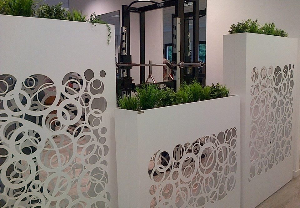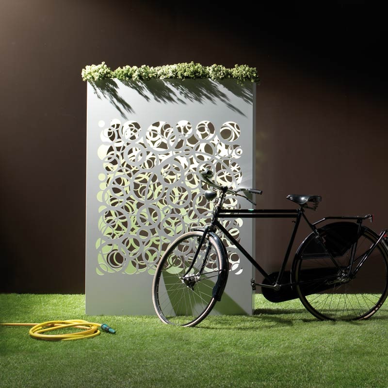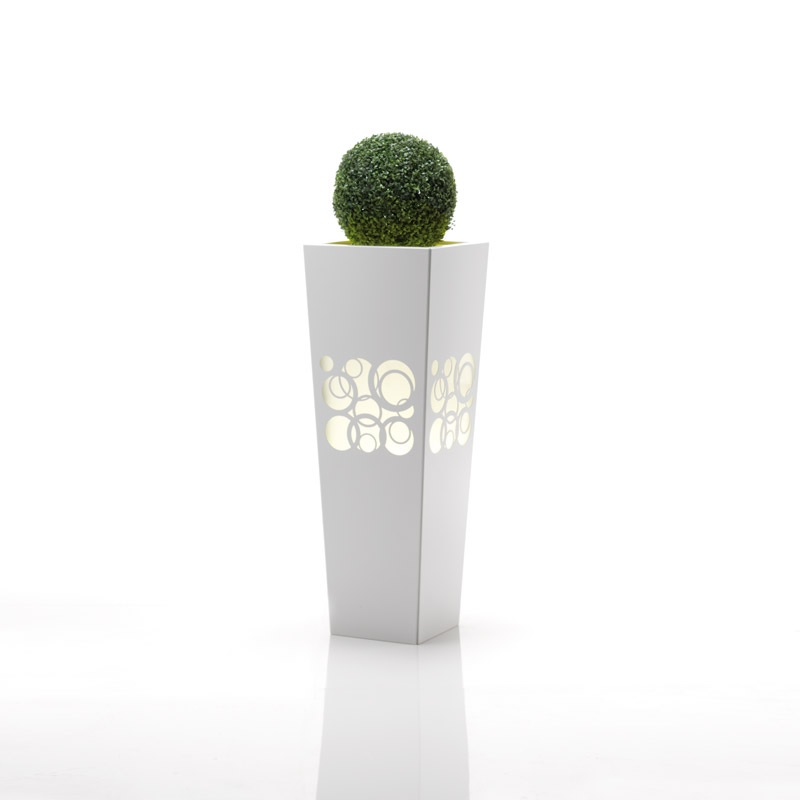 Fioriera traforata luminosa in acciaio inox o in alluminio smaltato in bianco opaco.