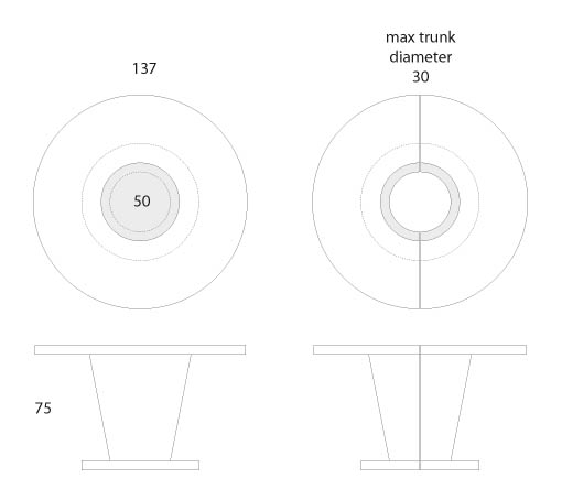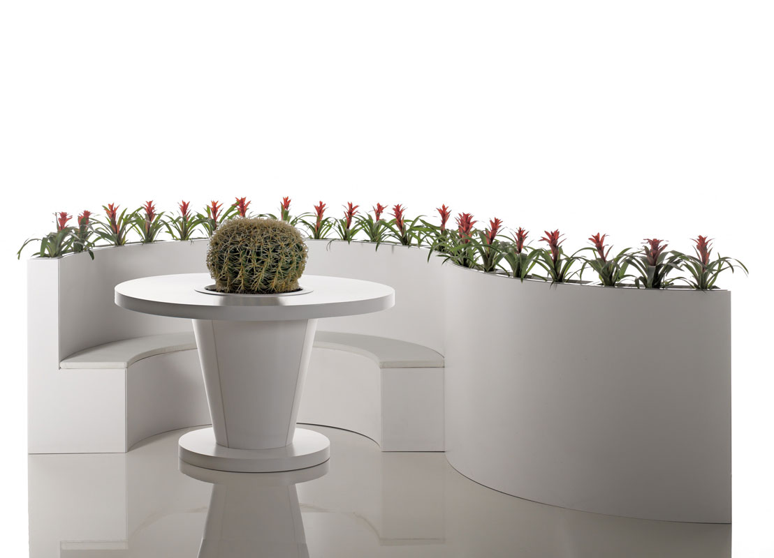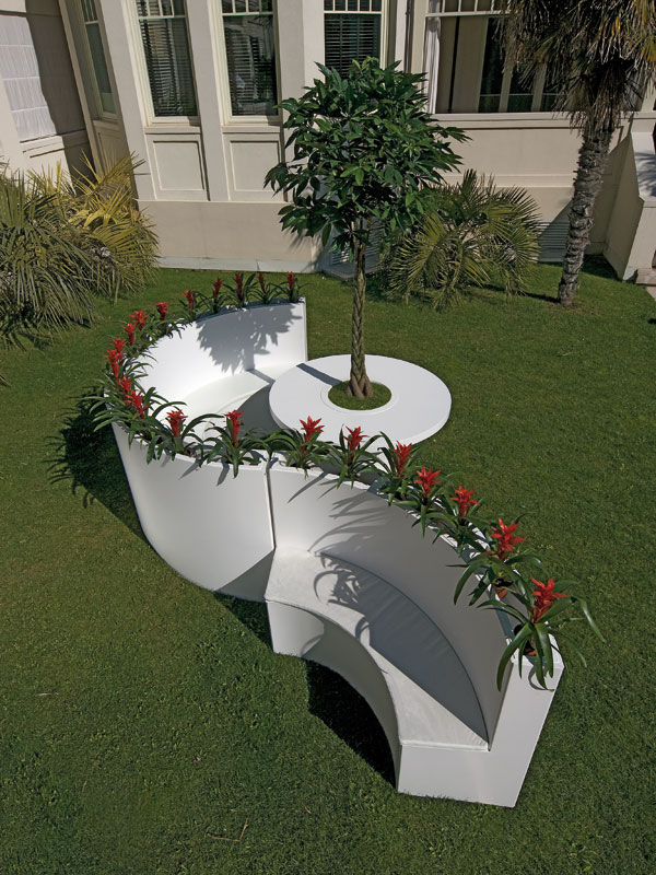 Sirkel tavolo fioriera rotondo in alluminio smaltato in bianco opaco, disponibile la versione in due semicerchi per posizionamento intorno ad alberi esistenti panca fioriera in alluminio smaltato in bianco opaco con cuscino in ecopelle