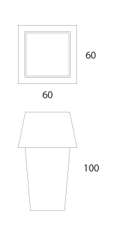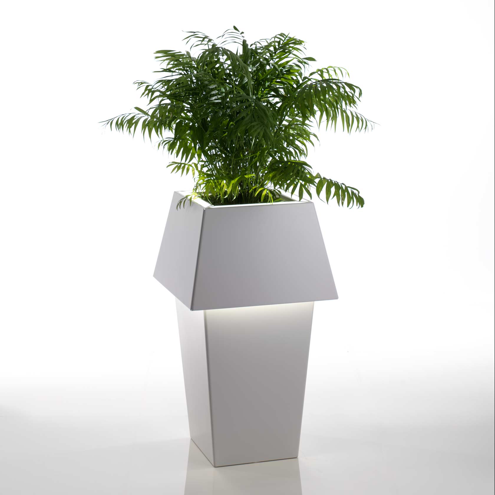 Fioriera luminosa in acciaio inox o in alluminio smaltato in bianco opaco. Una sorgente di luce interna dal basso per una doppia diffusione, verso la pianta e verso il corpo stesso dell’oggetto, che illumina a sua volta il pavimento.