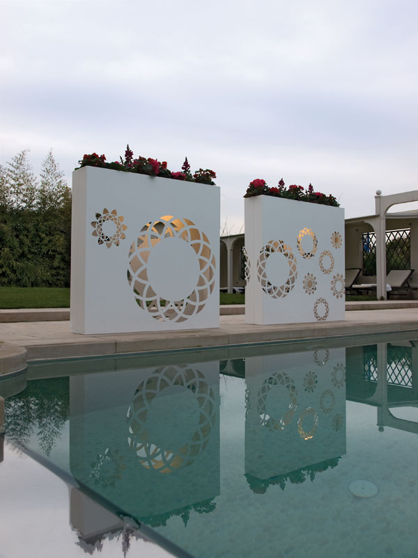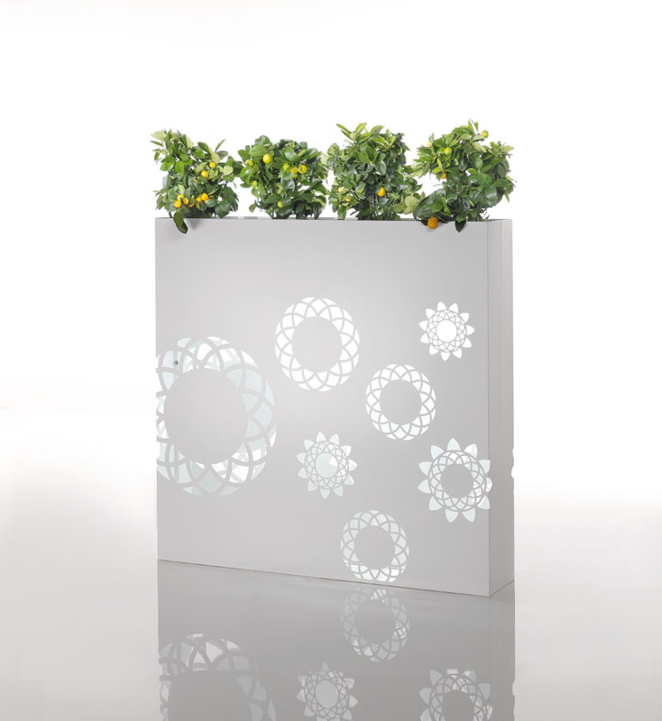 Fioriera traforata luminosa in acciaio inox o in alluminio smaltato in bianco opaco, disponibile in due varianti di traforo.