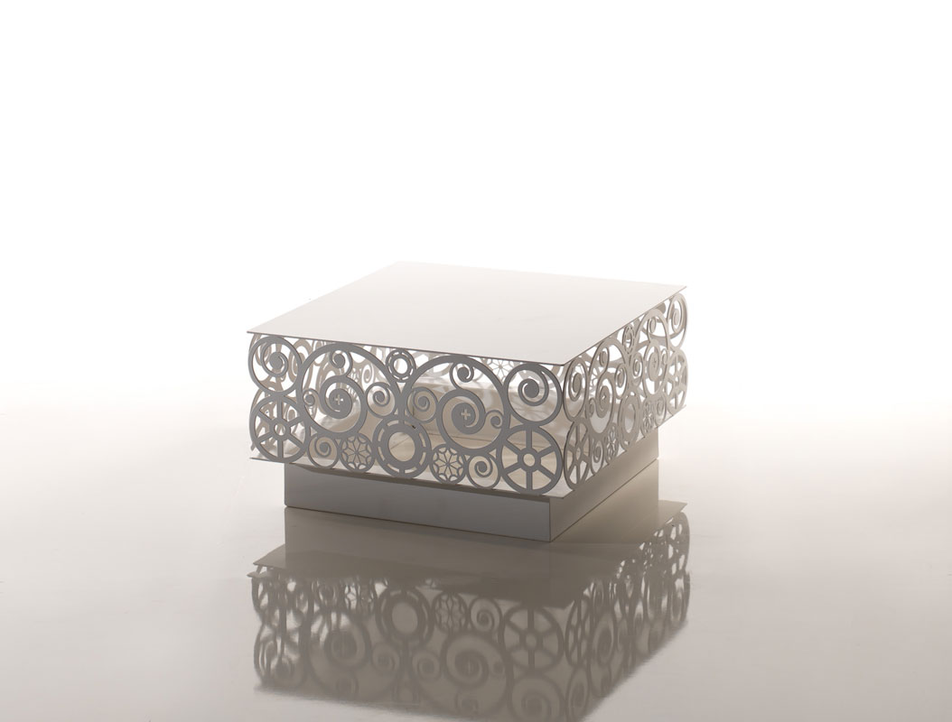 Tavolino basso con traforo in alluminio smaltato in bianco opaco