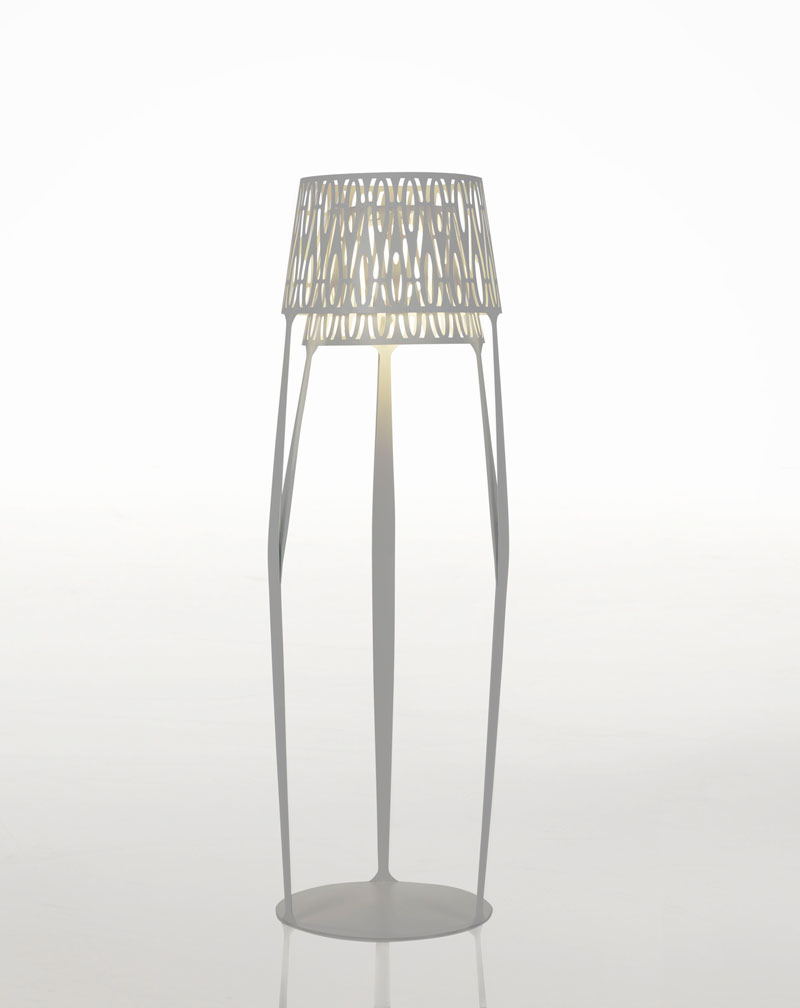 piantana da esterni e interni in acciaio inox smaltata in bianco opaco. Sorgente luminosa con alimentatore integrato protetta da diffusore in materiale plastico.