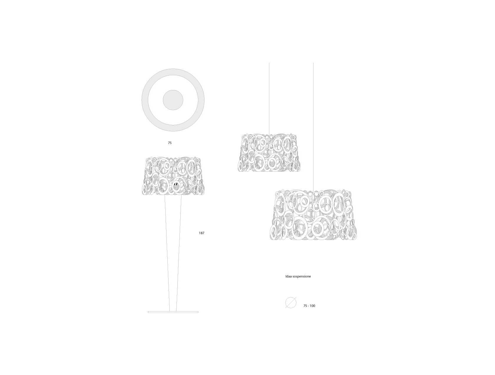 piantana e sospensione in alluminio da esterni e interni smaltata, con base e cap- pello in acciaio inox. Schermo diffusore in vetro opalino.